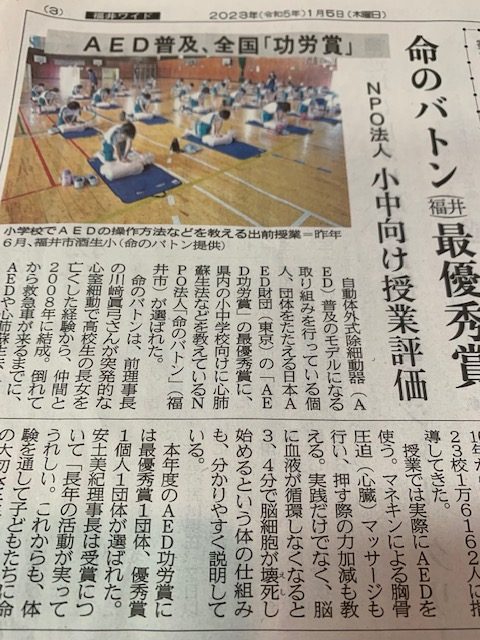 2023 年 1 月 5 日 / 最終更新日時 : 2023 年 1 月 6 日 pudding ボランティア 日本AED財団「AED功労賞」最優秀賞受賞 2022年12月、日本AED財団「AED功労賞」最優秀賞を受賞しました。 本日の福井新聞に取り上げていただきました。 13年間にわたり活動してきた仲間に感謝です! FacebookXBlueskyCopy